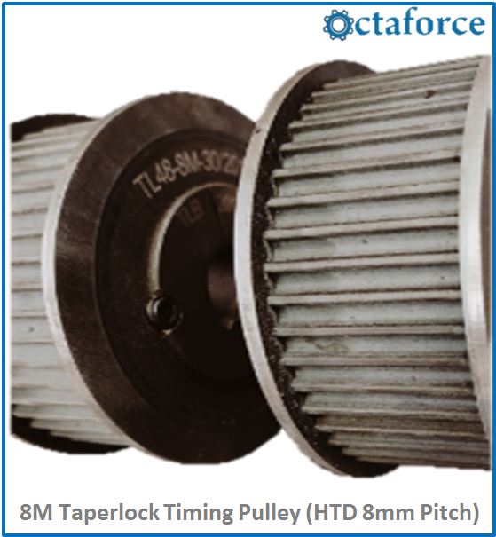 8M Taperlock Pulleys Octaforce are designed for tooth shape HTD 8mm and are manufactured in a wide range of Face (Width) such as 8M Taperlock Pulleys Octaforce for 20 mm belt width, 8M pitch for 30mm belt width, 8M pitch for 50mm belt width, 8M pitch for 85mm belt width. The taper lock bush (like 2012, 2517, 3020, 4040) in the 8M Taperlock Pulleys Octaforce is used to mount the shaft to the pulley and can be replaced on wear and tear without the need to replace the entire timing pulley. We also Manufacture these 8M Timing Belt Pulleys with QD (Quick detachable) bush and Power Lock Keyless Bush as per ISO 9000 standards.Octaforce HTD 8M Timing Pulleys are Manufactured in Cast Iron material (GG25 grade), Stainless Steel 304, Stainless Steel 316 material, and also in Alloy steel as per customers requirement and application.