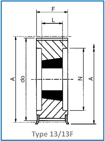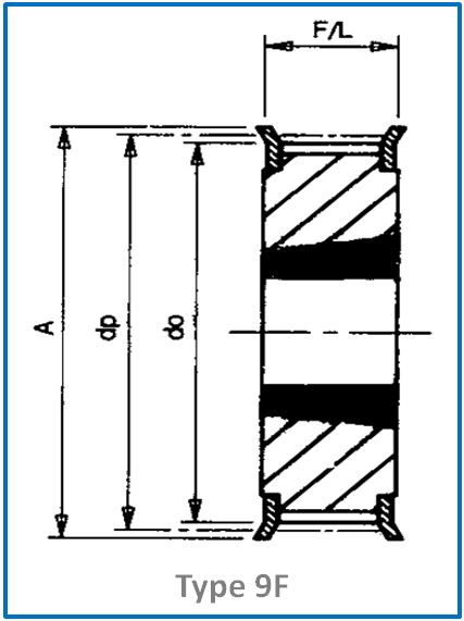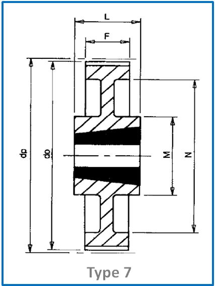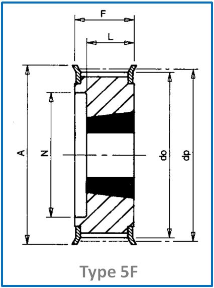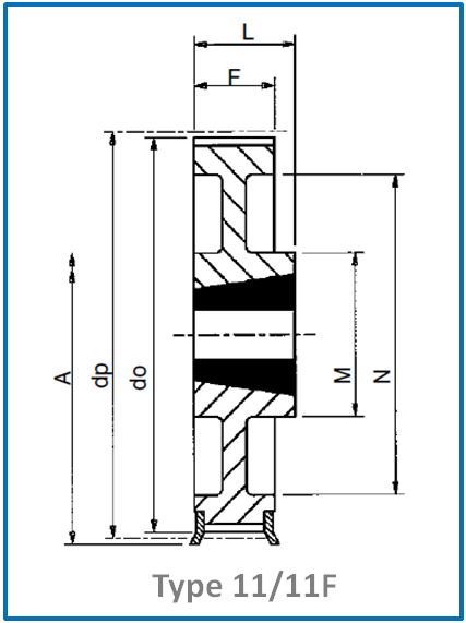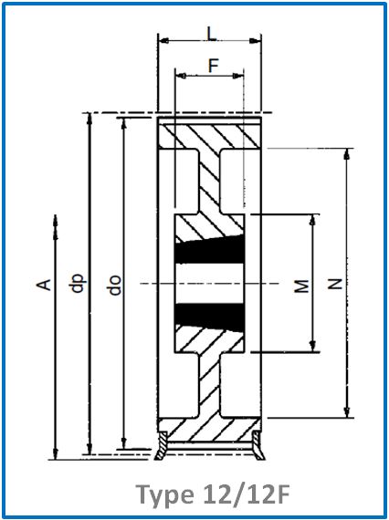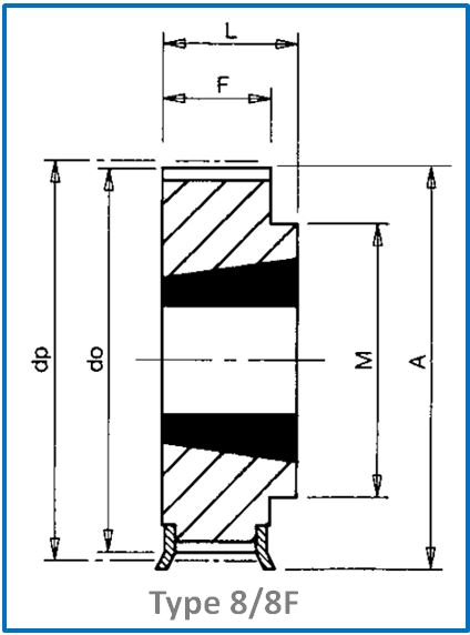 Industry Part No. No. Teeth Z Pulley Type Pitch Circle Dia. dp Taper Bush Ref. Max. Bore d Outside Diameter do Flange Diameter A Pulley Width F Bore Length L Hub Diameter M Rim Diameter N Approx Weight kg
