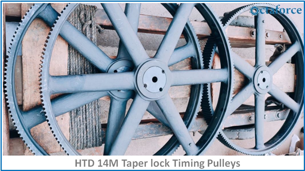 Timing Pulleys Octaforce 14M are designed for tooth shape HTD 14mm and are manufactured in a wide range of Face (Width) such as 14M pitch for 20 mm belt width, 14M pitch for 30mm belt width, 14M pitch for 50mm belt width, 14M pitch for 85mm belt width. Timing Pulleys Octaforce 14M Timing Pulleys Octaforce 14M The taper lock bush (like 2012, 2517, 3020, 4040) in the Timing Pulley is used to mount the shaft to the pulley and can be replaced on wear and tear without the need to replace the entire timing pulley. We also Manufacture these 14M Timing Belt Pulleys with QD (Quick detachable) bush and Power Lock Keyless Bush as per ISO 9000 standards.We at Octaforce Manufacture HTD 14M Timing Pulleys in Cast Iron material (GG25 grade), Stainless Steel 304, Stainless Steel 316 material, and also in Alloy steel as per customers requirement and application at our state of the art plant with 20 CNCs and 12 Hobbing Machines.
