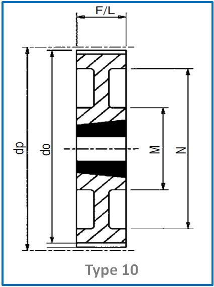Industry Part No. | No. Teeth Z | Pulley Type | Pitch Circle Dia. dp | Taper Bush Ref. | Max. Bore d | Outside Diameter do | Flange Diameter A | Pulley Width F | Bore Length L | Hub Diameter M | Rim Diameter N | Approx Weight kg |